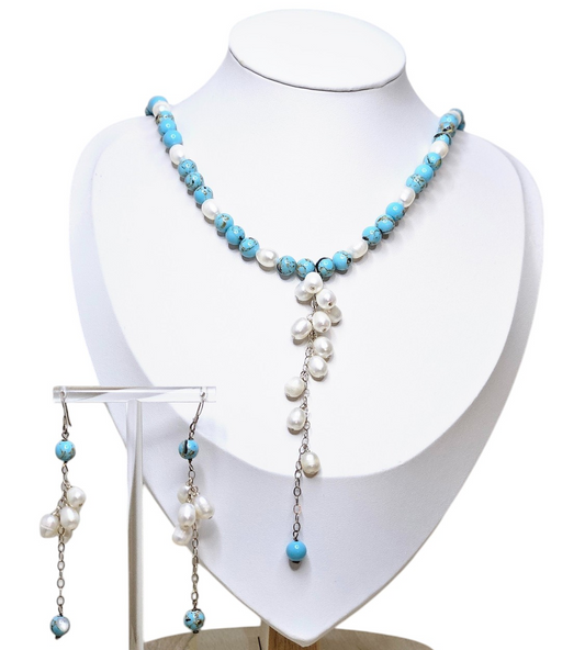Blue Turquoise Round Beads with Real River Pearls Necklace and Earrings for Weddings
