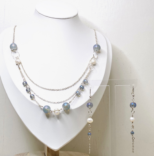 Elegant Pearl and Blue Crystal Bead Jewelry Set necklace and earrings