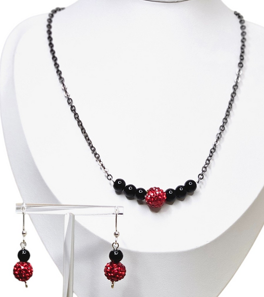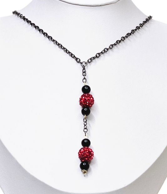 Elegant Romantic Red Rhinestone Studded Round Beads and Black Jasper Necklace