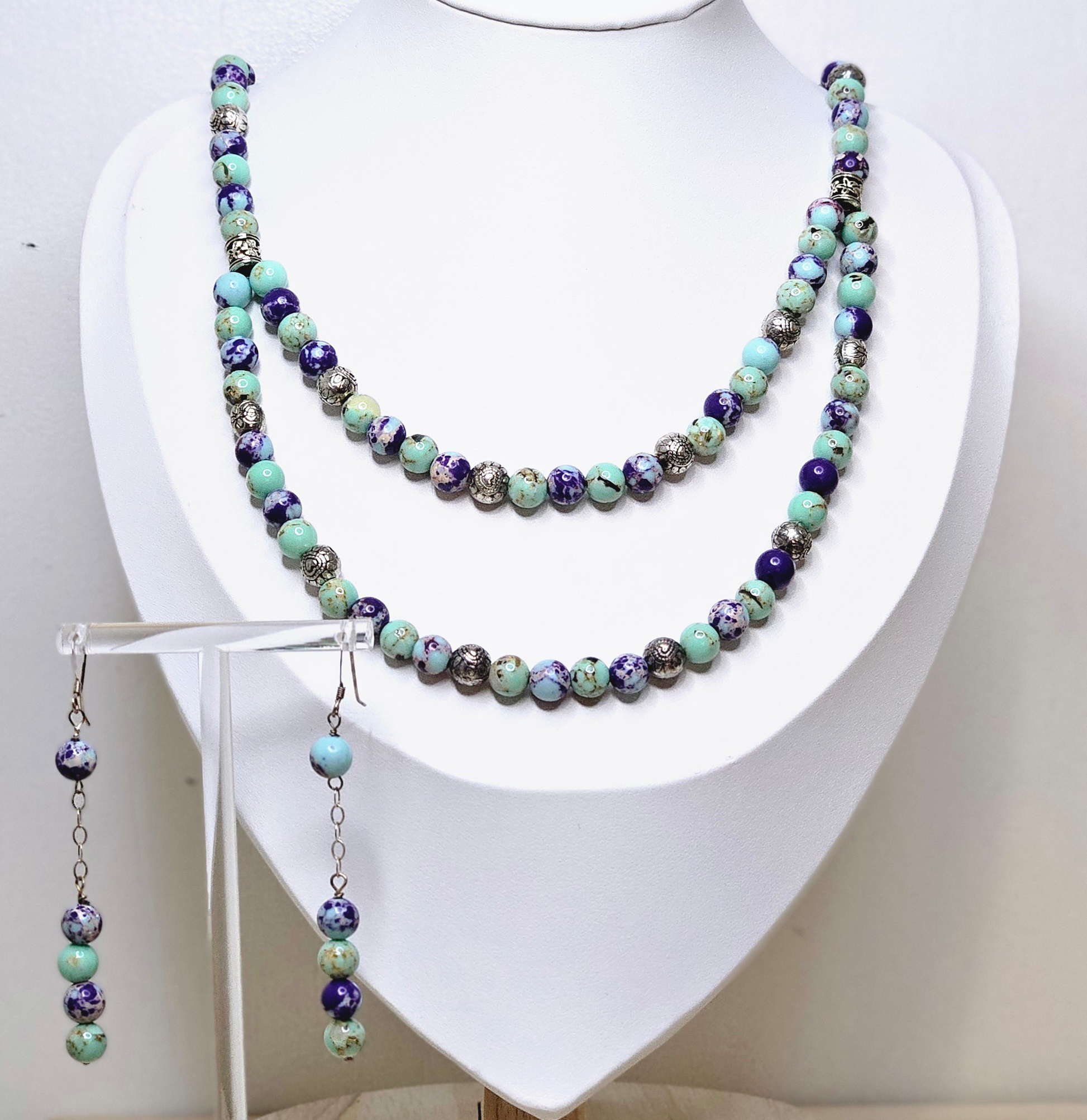 Purple Green Emperor Sea Jasper and turquoise beads necklace and earrings jewelry set